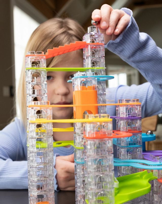 בונים את המסלול מקוביות שקופות וחלולות, מניחים את המסלולים הצבעוניים ויוצרים מדרון בו המעברים מתרחבים באופן בלתי נראה לעין ומדרון מהיר ומרתק.